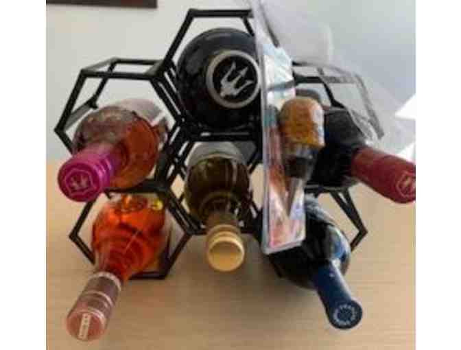 Wine holder and 6 bottles of various blends plus, a wine stopper!