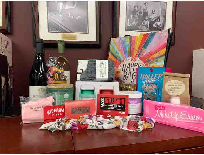 Take a night off, (or to enjoy everything in this basket, a whole month!) to spoil yourself! This basket includes 2 bottles of wine, (Chateau Le Rey Les Rocheuses Wine and Kendall Jackson Sauvignon Blanc), and Host Studios Wine Freeze/Cooling cups (set of 4) to enjoy with them. Also includes a Makeup Eraser, Cooling Eucalyptus Wooden Wick Candle, Breathe Easy Eucalyptus Shower Steamers, and Lavender Bath Fizzies to create the perfect bath. Afterwards, cuddle up in your Worlds Softest Cozy Socks (Grey) with the Naked Bee Mini Bee Kit in Orange Blossom Honey (lotion, chapstick, hand sanitizer), Holler and Glow Face and Pedi Mask, Decorative Hair Tie, and Bedr Chocolate Bag! After this R&R, you will be refreshed to wear your new Kate Spade Earrings, Decorative Reusable Bag, and use your $40 Hal Smith Gift Card, $25 GoGo Sushi Gift Card, and $35 Hideaway Gift Card.