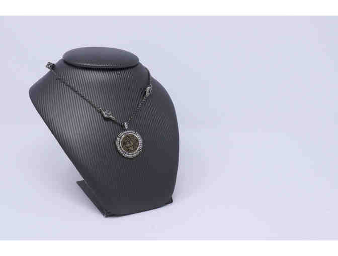 The coin is surrounded by cubic zirconia and the chain is embellished with the old world vintage charm.