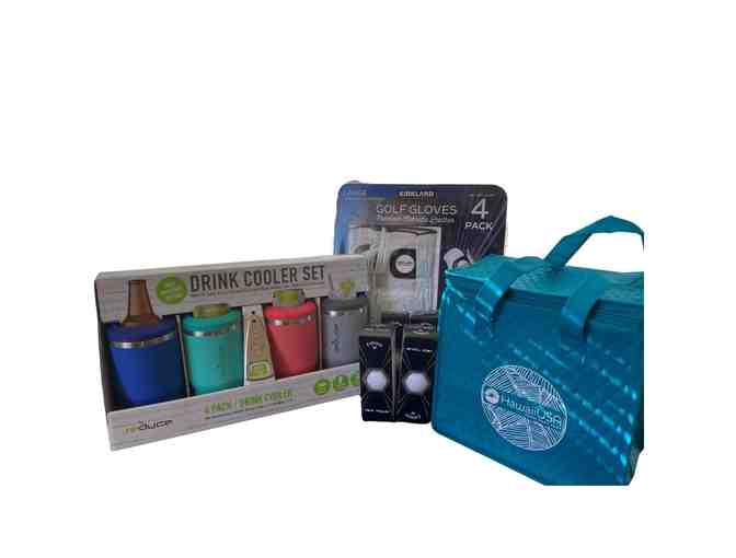 Enjoy this basket on a summer day on the golf course! Basket includes 4 packages of Callaway golf balls, a set of 4 golf gloves, a set of 4 drink coolers, and a lunch sack to keep your perishable foods cool.