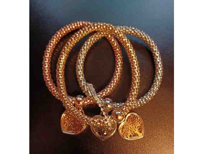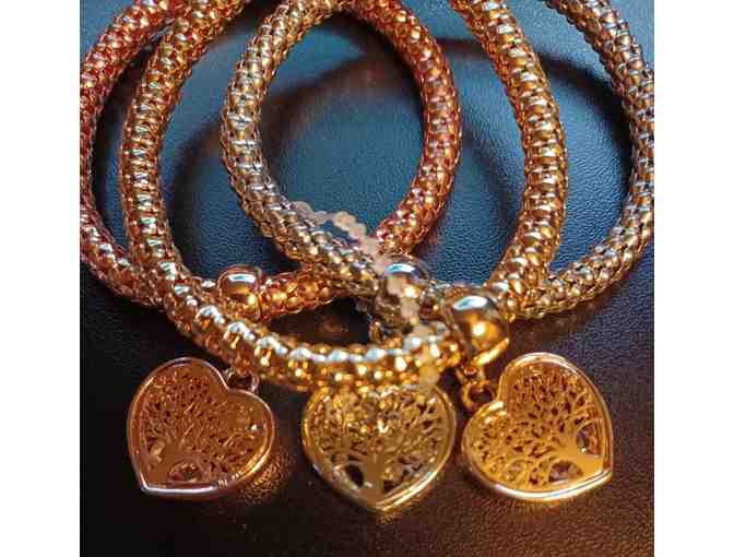 3 piece set. Including one silver, one gold, and one rose gold plated charm bracelets. - 7.85"; Gold/ Silver/ Rose Gold Plated (includes gift bag and gift box)