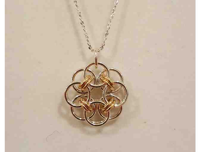 Chain maille necklace "The Helm" is hand-crafted by Jim Bellows of Squirrel-Eze Artisan Jewelry and Textiles of Harvard, MA.  "The Helm" is Nordic-celtic in design in sterling silver with 14K gold filled accents.  The 16" chain is is also sterling.  The pendant measures 3/4".