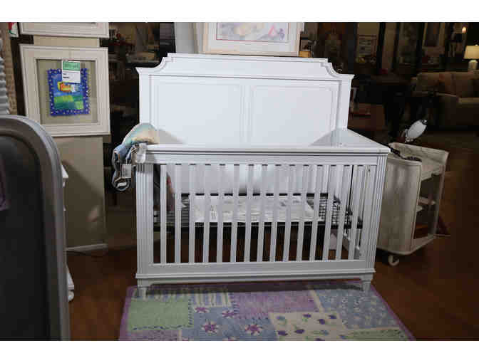 This white convertible crib is a “Build to Grow” crib from Stone and Leigh. The pristine white crib converts from a full crib to a toddler bed to a full size bed, so the bed will transition with your child from infancy to high school.