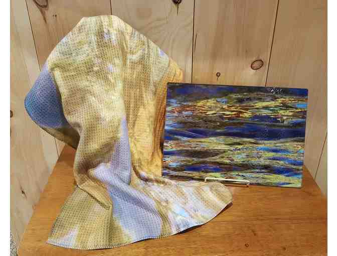 The images on the cutting board and tea towel are from Eyes of the World, Nature Photography by Terri Ackerman. Terri travels the globe capturing nature's beauty. She also works close to home--the river pictured here is the Sudbury in Concord MA. The digitally enhanced images come from reflections of trees, plants, and waves on the river.