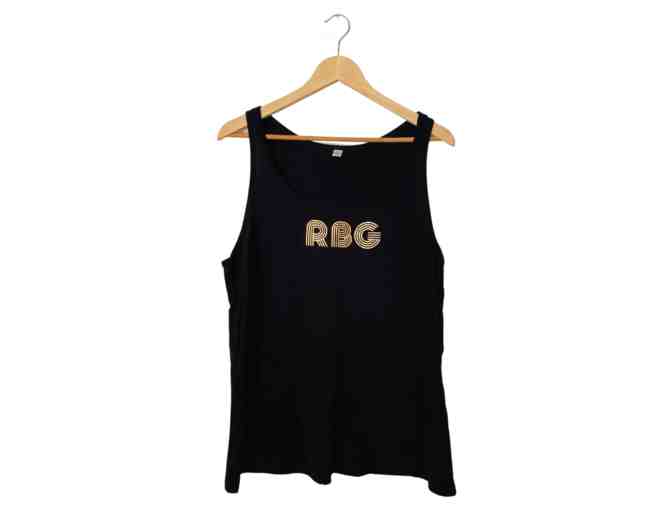 Aloha State T-Shirt Co "RBG" tank top. An homage to the Notorious RBG (former US Supreme Court Justice Ruth Bader Ginsburg). Black tank top, size Large, gold lettering.