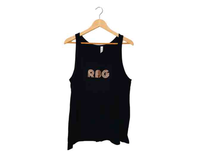 Aloha State T-Shirt Co "RBG" tank top. An homage to the Notorious RBG (former US Supreme Court Justice Ruth Bader Ginsburg). Black tank top, size Large, rose gold lettering.