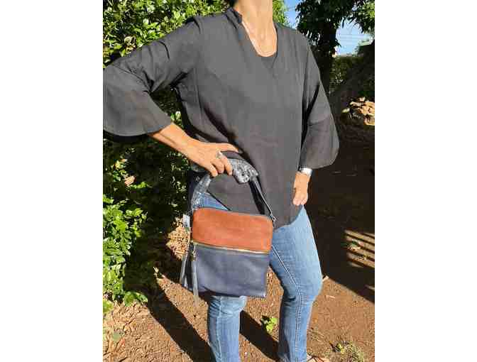 Women's Dressy Black Top (3XL), polyester fabric and purse (blue and tan on one side, all blue on opposite side).