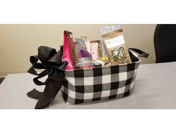 Godiva Chocolates, Foot Cream Massager, Candle, Soup, Cocoa, Kleenex, Bar Hill Honey, Zach Woods Herb Farm loose leaf tea, Darn Tough Socks, Daily Chocolate Cow, Bar Hill Hand Sanitizer, Mug, Candy. How can you not get better after enjoying this basket!
