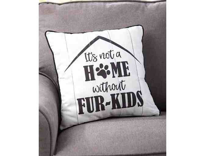 Show off your love of all furry four legged pets with this adorable accent pillow. Pillow is white with the saying "It's not a Home without Fur-Kids" and the O in home is replaced with a paw print.