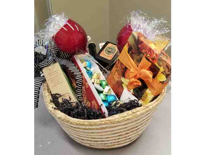 This basket has everything you could imagine for an evening for entertaining! Lake Champlain Chocolates, Snow Flake Chocolates, Wines, to include: LaGaragista Biodynamic, Harlots & Ruffins Dame Jeanne, Stolen Roses (sparkling cider), 4 Homeport napkins, Wine glasses, 4 Cheeses: Blueberry, Windsordale/Wenslaydale, Cheddar, Provolone Picante and Manchego, Crackers, Salami/meats.
