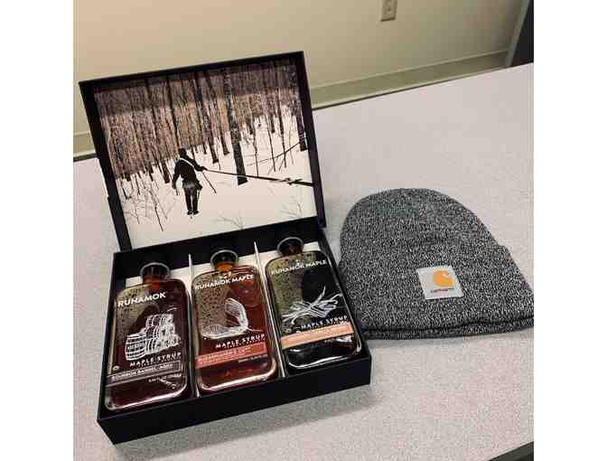 Donated by Runamok Maple, an amazing and beautiful addition to any pantry and an exceptional gift; a collection of flavored maple syrup as well as a Carhartt Beanie.