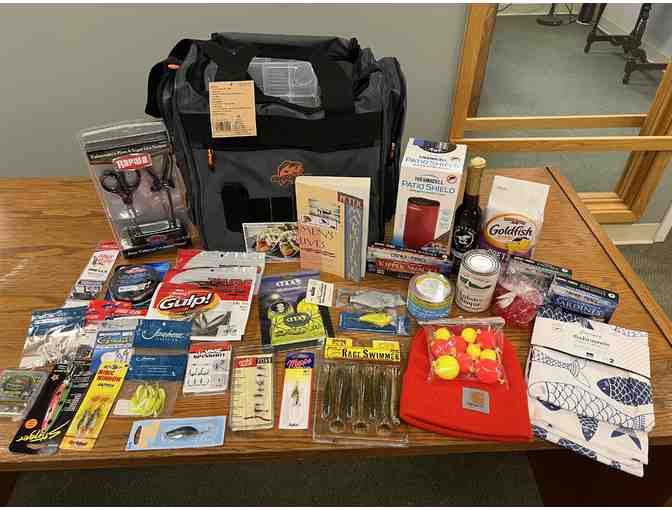 This basket is a fisherman's delight. It contains a fishing tote with two utility boxes, Thermacell mosquito repellant, reading material: Men's Lives (book about Long Island fishermen and a gift card to Crow Books), assorted fishing tackle: lures, bait, hooks, fishing line, weights, bobbers, flies, fishing pliers and scissors, headlamp, Carhartt Beanie, and after the catch items: olive oil, recipes, fish related snacks, fish bottle opener and fish dish towel.