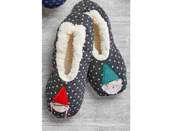 Keep your feet cozy and warm this season with these adorable plush slippers that feature an embroidred girl and boy gnome on each foot and skid resistant dots on the soles.