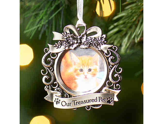 Preserve the memory of your departed furbaby with this metal Memorial Frame Ornament. Frame reads "Our Treasured Pet." with paw prints. Ornament comes ready to hang on the tree - just add a picture of your furbaby.