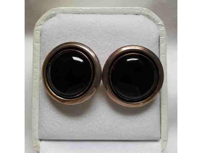 These earrings are elegant in their simple design. Lovely round onyx cabochons are bezel set in sterling with a secondary band of sterling to frame them.