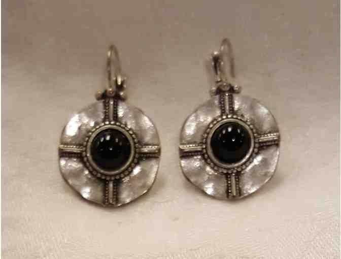 This pair of earrings features bezel set onyx stones set at the center of a southwestern design. Fine silver bead work. The backs are unmarked but the metal is likely sterling. No makers mark.