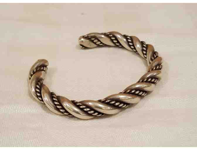 Classic Navajo design bracelet features two twisted bands of silver forming this elegant, heavy piece. Piece is unmarked; believed to be sterling.  This bracelet design has come to be known as the "Horse Whisperer" bracelet after a piece of this design was seen on the wrist of Robert Redford in the film of that name.  This piece up for bidding in our auction existed for several decades prior to the making of that 1998 film.