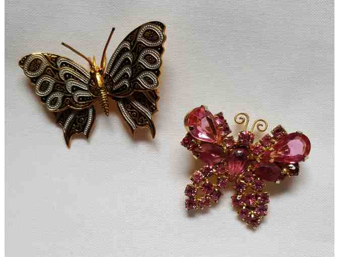Two butterfly pins with very different personalities. One is an elegant creature featuring intricate white and black inlay with gold tone details. The other is colorful and whimsical set with pink rhinestones and adorable curled antennae. Neither pin bears any makers marks.