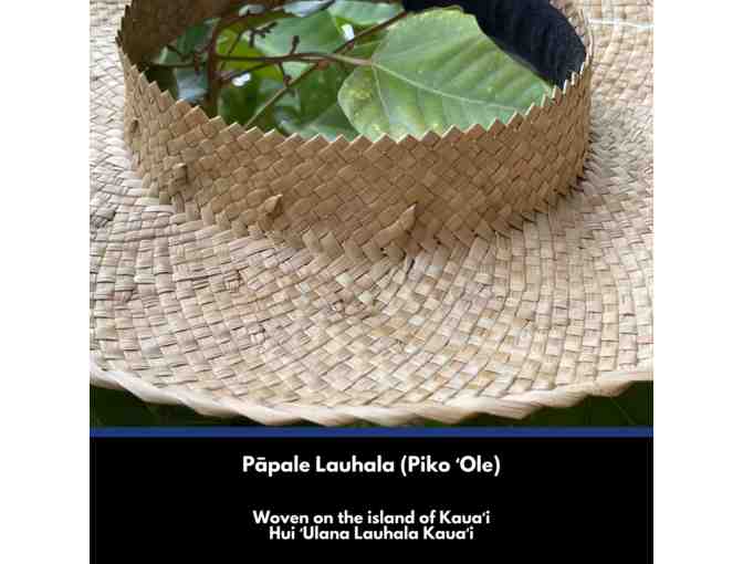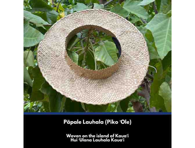 This papale lauhala (pandanus hat) piko ole (crownless) is a Hawaiian style open crown hat woven (actually plaited) of carefully prepared and stripped lauhala, or leaves of the pandanus tree, a natural fiber. It was woven on the island of Kauai by a member of our community weaving group on Zoom led by Kumu Maile Andrade. It is a piko ole hat with a niho design on the top of the band of the hat.
