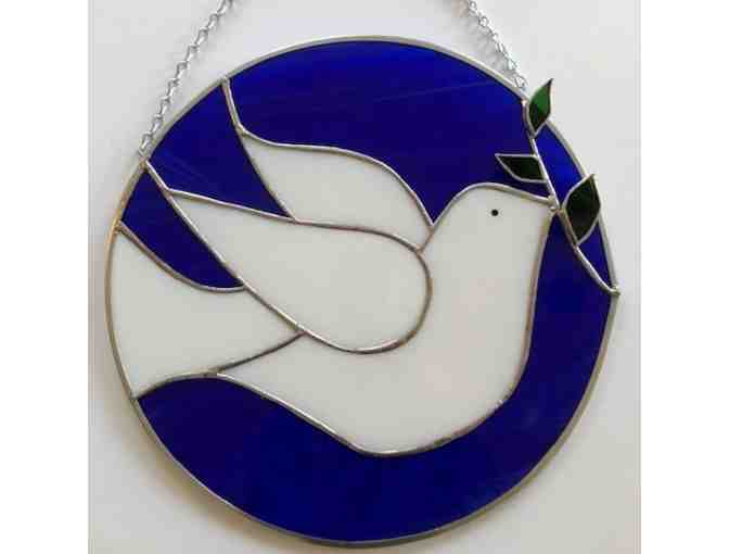 Bring some peace into your home with this gorgeous, handcrafted, hanging stained glass piece. This 12” diameter, circular window hanging is perfect for the holidays. White dove of peace holding a myrtle branch with blue background.