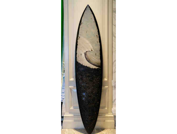 When Trevor got the board, it was the day before the oil spill happened on the Southern California coast. He collected some of the oil from the spill and mixed that with tar which made up the bottom dark space to represent the destruction he saw. By using rusted nails, he reflected on the age of the beaches and how they have been around much longer than we have. He has spent so much of his life in the ocean, and that has impacted him as an artist and a surfer. Seeing the coastline covered in oil was heartbreaking, so he decided to create a piece that will bring awareness to the fact that we need to protect our oceans and prevent disasters like this in the future. His board is designed on a Brawner surfboard.