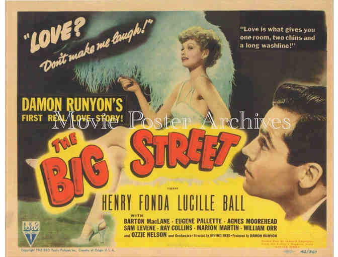 The Big Street, the 1942 Irving Reis romantic comedy starring Henry Fonda, Lucille Ball, Agnes Moorehead, Sam Levene, Barton MacLane, Eugene Pallette, Ray Collins, Marion Martin, George Cleveland and Ozzie Nelson.
