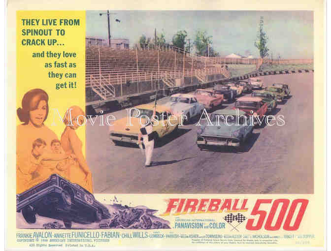 Fireball 500, the 1966 William Asher stock car racing comedy drama starring GFrankie Avalon, Annette Funicello, Fabian, Chill Wills, Harvey Lembeck, Julie Parrish, Douglas Henderson and Baynes Barron.