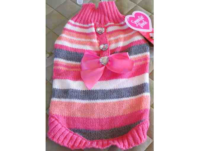This Smoochie Pooch sweater has white, peach, pink, and gray stripes with 3 sparkly hearts, one in the center of the lighter pink satin bow. A sweater for all occasions and one that your little princess will always look cute in.