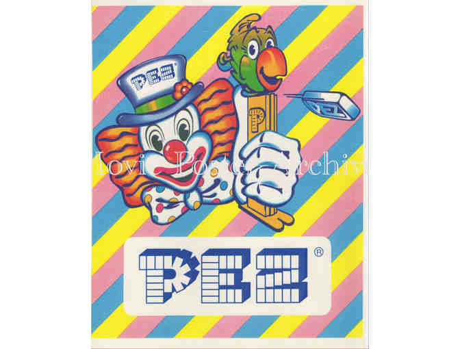 This is a reproduction of a vintage PEZ advertising poster. PEZ started in 1927by Eduard Haas III in Austria and was originally called Pffefferminz which in German means peppermint. They were initially distributed in metal tins. The name was changed by taking the first letter, middle letter and last letter to make PEZ. In 1952 they opened in the U.S. and in 1956 created the first dispenser as a space gun and has continually released a huge variety of dispensers since then and is still operating.