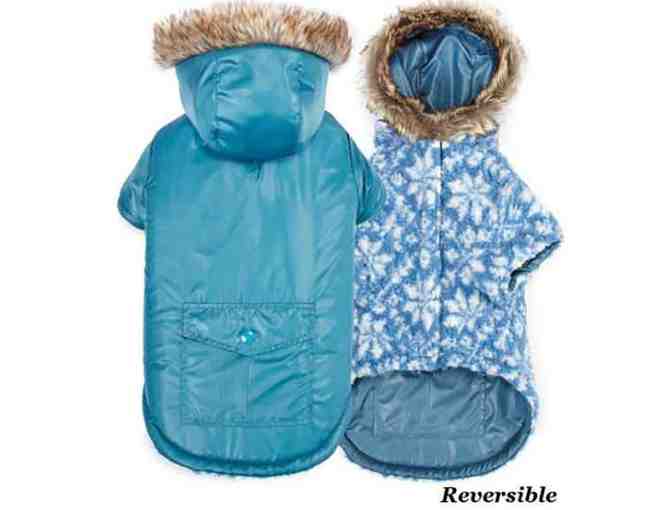 Dogs won't shy away from the flakes in this warm Zack and Zoey Elements Reversible Thermal Dog Parka in Blue!  The Outer shell protects against cold weather and the inner thermal layer provides warmth without weight or bulk.