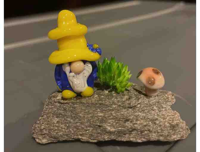 Show your Williams School spirit with this one of a kind, handmade glass gnome!! He sits about 2" high on a piece of granite. Each gnome and mushroom are made by melting glass with a torch, using oxygen and propane. Custom ordered welcomed!