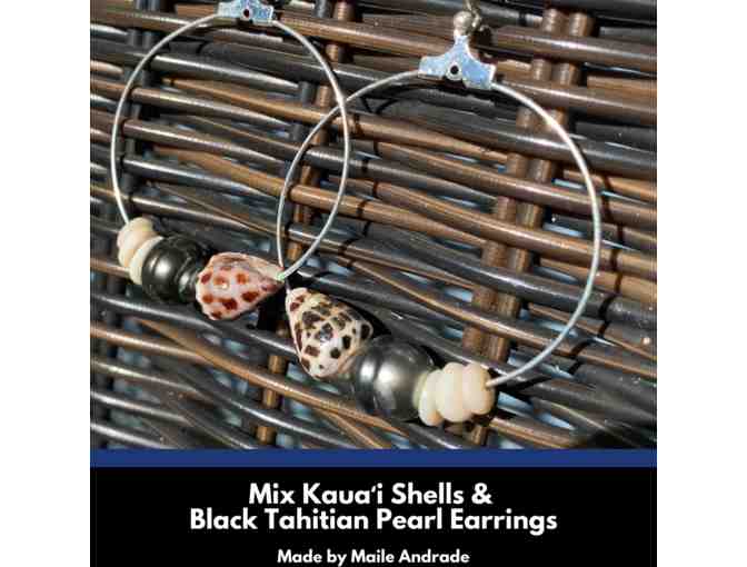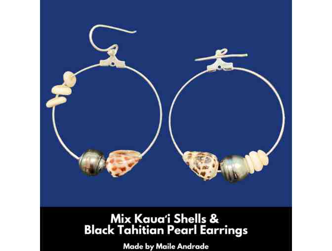 These are handmade Kauai Earrings by Native Hawaiian Artist and Professor at Kamakakuokalani Center for Hawaiian Studies, Maile Andrade. They include a mix of beautiful Kauai found shells and Tahitian black pearls.