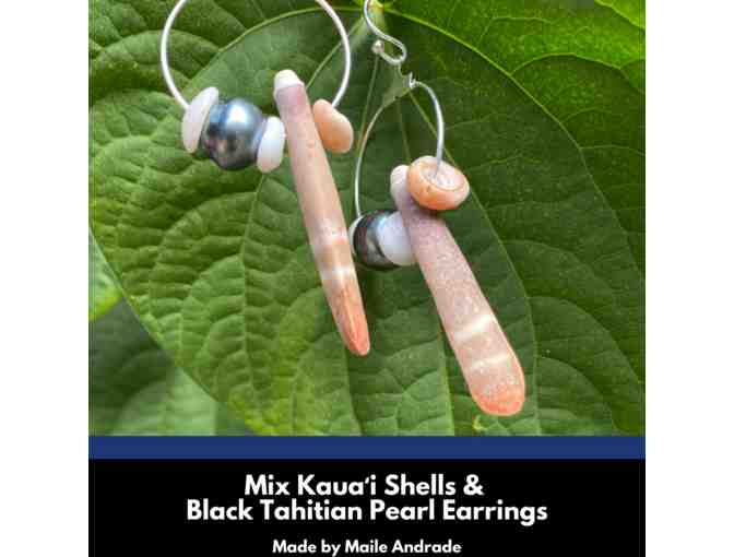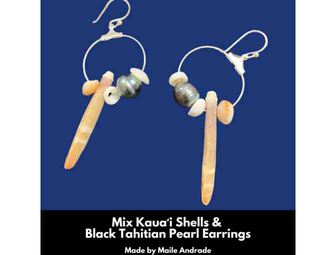 These are handmade Kauai Earrings by Native Hawaiian Artist and Professor at Kamakakuokalani Center for Hawaiian Studies, Maile Andrade. They include a mix of beautiful Kauai found shells and Tahitian black pearls.