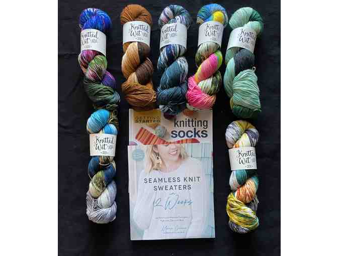 This knitting package includes: 7 beautiful hand- dyed skeins from Knitted Wit (80% superwash merino, 20% nylon, 420 yards each) as well as books by well -known knitting authors: Seamless Knit Sweaters by Marie Greene and Knitting Socks by Ann Budd. Perfect for your own creations and/or holiday gifts.
