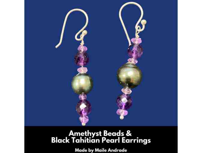 These are handmade Kauai Earrings by Native Hawaiian Artist and Professor at Kamakakuokalani Center for Hawaiian Studies, Maile Andrade. They include a black Tahitian pearl and multiple amethyst beads.