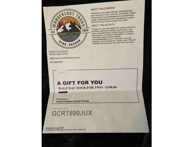Experience the wonder and sights of Central Oregon with this gift certificate for a half-day tour for two people from Wanderlust Tours. Choose from beer and wine tours, canoeing, snowshoeing and more! Wanderlust is the premiere adventure company with endless options, including customized tours for groups.