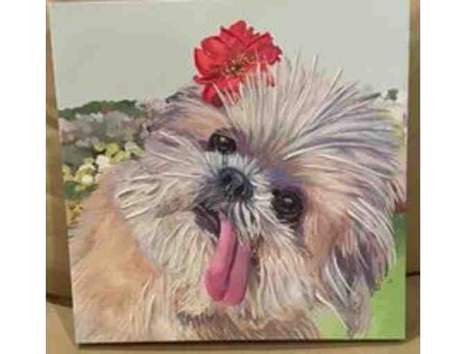 This little Shih Tzu makes me smile every time! She has a red flower in her hair and her little pink tongue hangs out in true Shih Tzu style. The detail on the print is beautiful and the picture doesn't do it justice. It is a 16x16" print on canvas, with raised acrylic strokes to highlight details..
