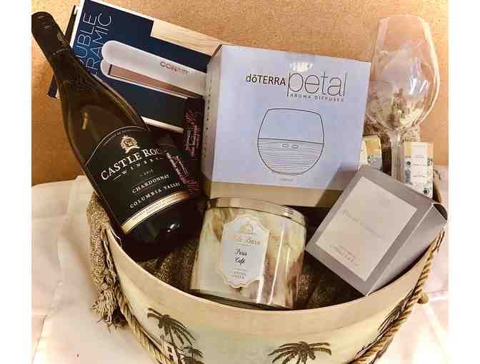 Bring the spa to you with this fabulous spa collection of cool. Your spa basket includes sand color chenille throw, double ceramic flat iron, aroma diffuser with oils, bath salts, candle, Taraji P. Henson Viva Glam lipstick and gloss, bottle of Castlerock Chardonnay and iridescent wine glass. All stored in a beautiful Santa Barbara decor hat box with lid.