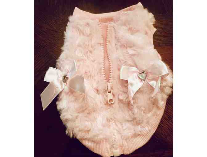 Your furbaby will be strutting her stuff down the runway with this adorable pink jacket. This is a step in sweater with a zip up back - with fur and bow accents.