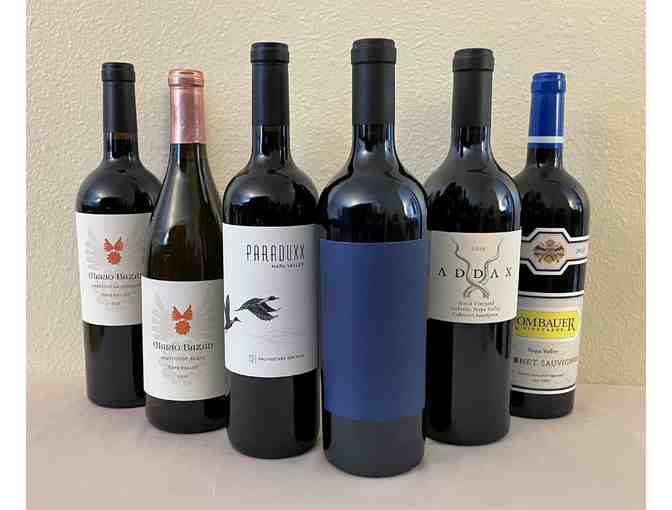 Six bottles with one 750ml of each: 2018 Rombauer Vineyards Cabernet Sauvignon, 2015 Mario Bazan Cabernet Sauvignon, 2015 Paraduxx Duckhorn Proprietary Red, 2019 Institution Houyi Vineyard and Pritchard Hill Cabernet Sauvignon, 2019 Addax Trench Vineyard Cabernet Sauvignon, and 2016 Marion Bazan Sauvignon Blanc