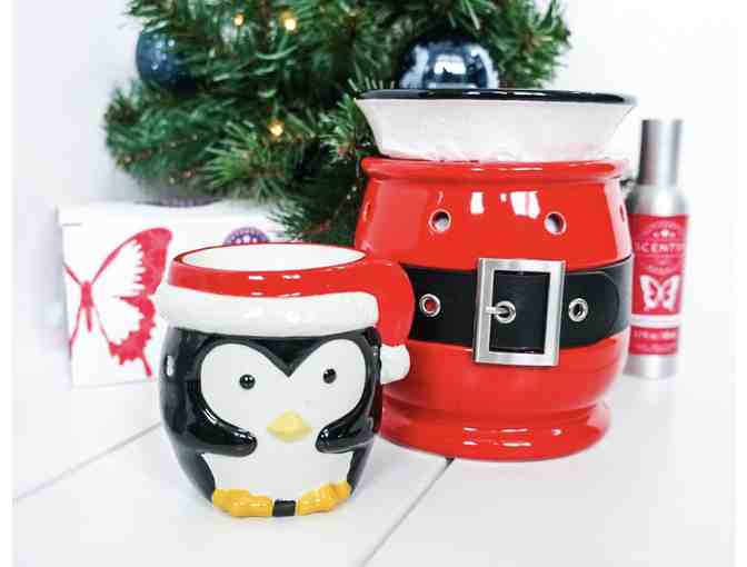 Basket includes: Jolly Scentsy Warmer, Baby Tux Mini Warmer, Fragrance Flower (Christmas Cottage), 3 Scentsy Bars (Vanilla Blackberry, Stargazing, Christmas Cuddles), Room Spray (Candied Cranberry Pecan) and Body Butter (Sugar).