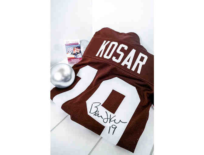 Signed jersey from Cleveland Brown fan favorite, Bernie Kosar, quarterback from 1985 to 1993. Includes a note of authenticity.
