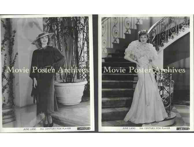 This is a group of 10 classic 8x10 celebrity photographs (9 stills have the studio writeup stamped on the back) of June Lang consisting of publicity, portrait, stills, movie scenes or leisure images. These are all hi quality images from various unknown origins. Because these photos were acquired from a variety of sources, there may be variations in size, quality, paper weight and clarity.
