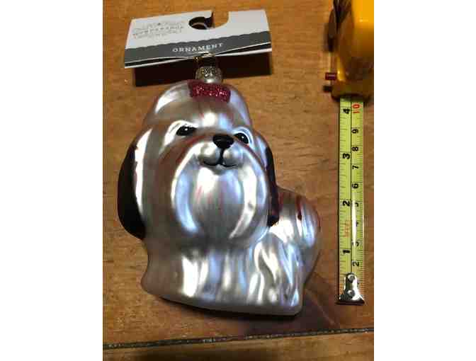 This smiling silver and black Shih Tzu is wearing a red bow in her topknot. Win it for your own Christmas Tree or as a gift to your Tzu loving friend.