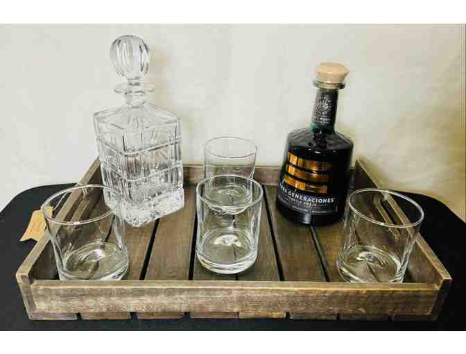 Fantastic setting of 4 rocks glasses and decantur with bottle of Tres Generacions and matching bar wear