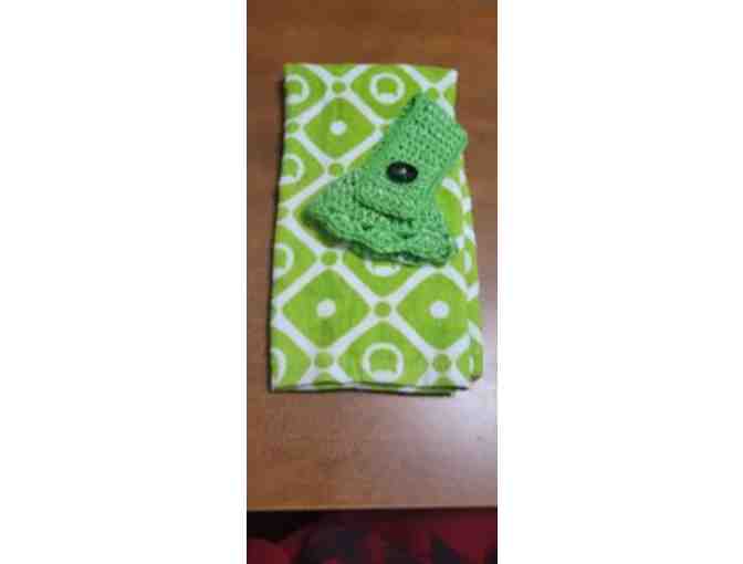 It's not easy being green. The winning bidder will receive two terry kitchen towels in white with green cat outlines and two green with white handmade towel hangers.