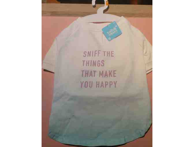 What better way for your pup to show off his curves in this adorable Tshirt from Tails&Noses? White Tshirt with fading blue and the saying 'Sniff The Things That Make You Happy'.