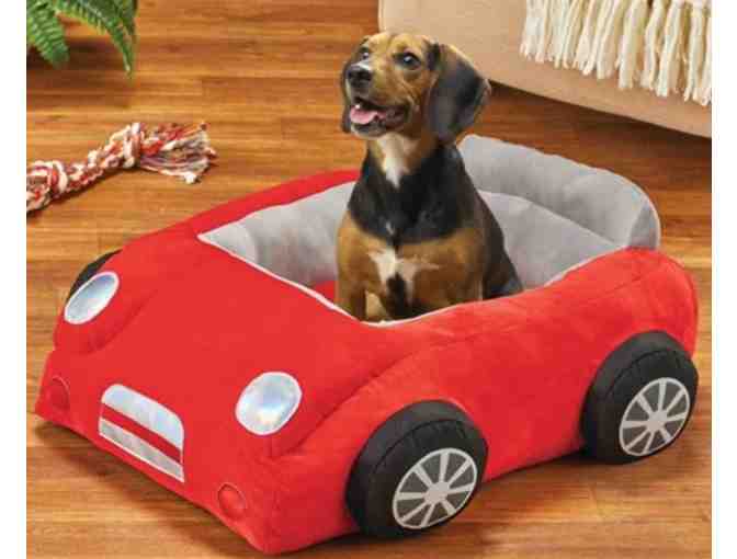 Your pet is ready for the races with this adorable car bed. The comfy plush bed is bright red and is shaped like a sports car, with a removable cusion and skid resistant bottom.