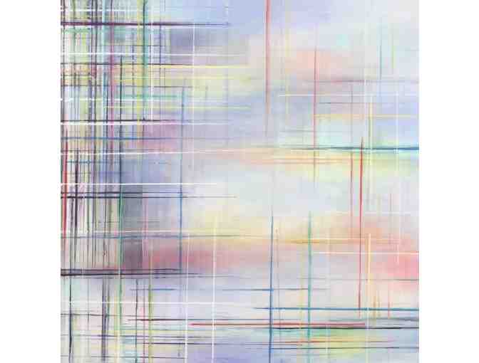 Resonance was a work painted in reference to the musical track Elaenia by Floating Points. Listening to the push and pull between the static and electric buzz and the light, airy melody made me think of the push-and-pull between what is naturally occurring and humanmade. Humanity creates interference that, when balanced, can still be harmonious with nature. When they are balanced, the space between them is full of beautiful resonance. It was this that I wanted to capture in this abstract work.