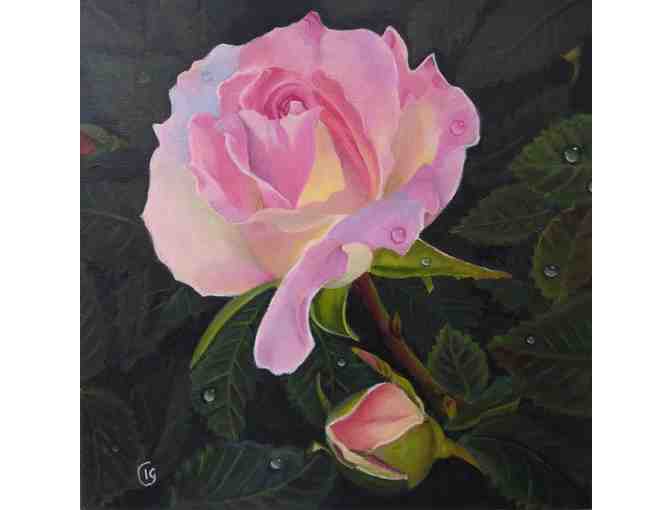 Tiffany roses are beautiful, tall and reveal many shades and values in their delicate petals. They are a classic hybrid tea rose that have interesting blooms of pink and yellow hues, with hints of violet and blue shades amongst the petals. This soft attractive colourful rose inspired me to paint this painting for this year's art charity event.